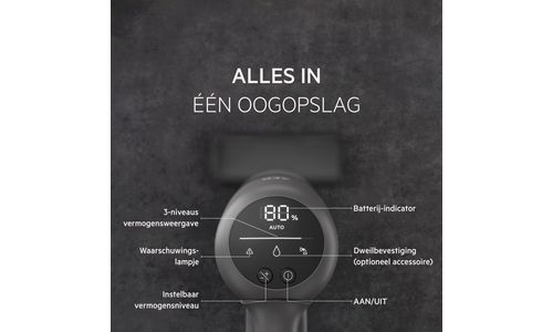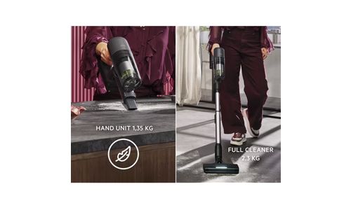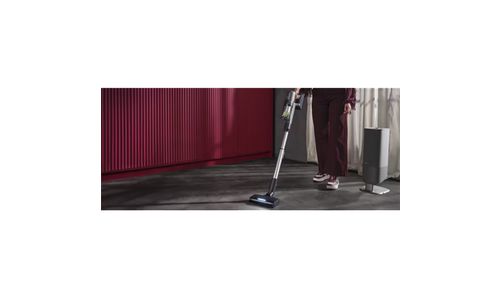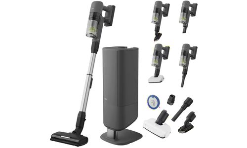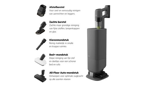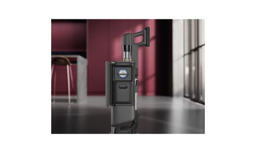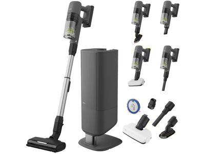 Pallet: 24 / Kleur: Dark Grey 56% gerecycled / 21,6V (2500mAh) / van 9 tot 50 min / AllFloor Auto zuigmond met Led / Delicate mondstuk /BedPro+ turbomondstuk / All-in-1 leeg- en laadstation voorzien van extra oplaadadapter