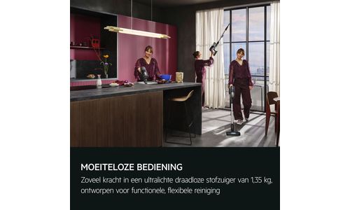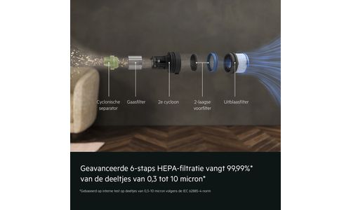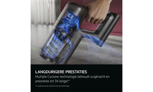 *In vergelijking met een enkelcycloonmotor in snoerloze stofzuigers. **Gebaseerd op interne tests volgens IEC 62885-4