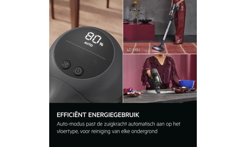 Slim en efficiënt reinigen van alle vloeren met Auto Mode. De sensor past de zuigkracht in real time aan voor optimale prestaties en een lange gebruiksduur*. Altijd de juiste kracht bij de hand. Reinig tot 40 minuten met de volledige stofzuiger**, tot 151 m²*** en tot 50 minuten met de handunit.**