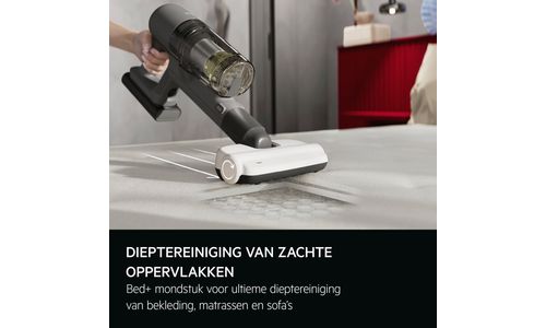 Het Bed+-mondstuk met een combinatie van borstel en rubberen strips zorgt voor een hygiënische dieptereiniging van alle soorten bekleding en matrassen, en verwijdert allergenen. Dankzij het slimme ontgrendelsysteem van de borstelrol verwijder je eenvoudig haren en vezels.