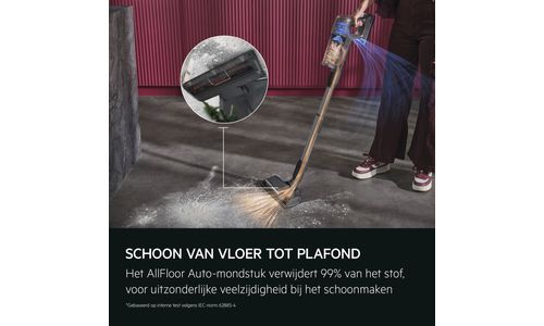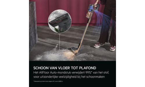 Krachtig in elke beweging op elk vloertype. Hij neemt tot 99%* stof op bij zowel voorwaartse als achterwaartse beweging, voor sneller reinigen. Het AllFloor Auto-mondstuk glijdt moeiteloos van harde vloeren naar tapijt en pakt vuil en stof grondig op.